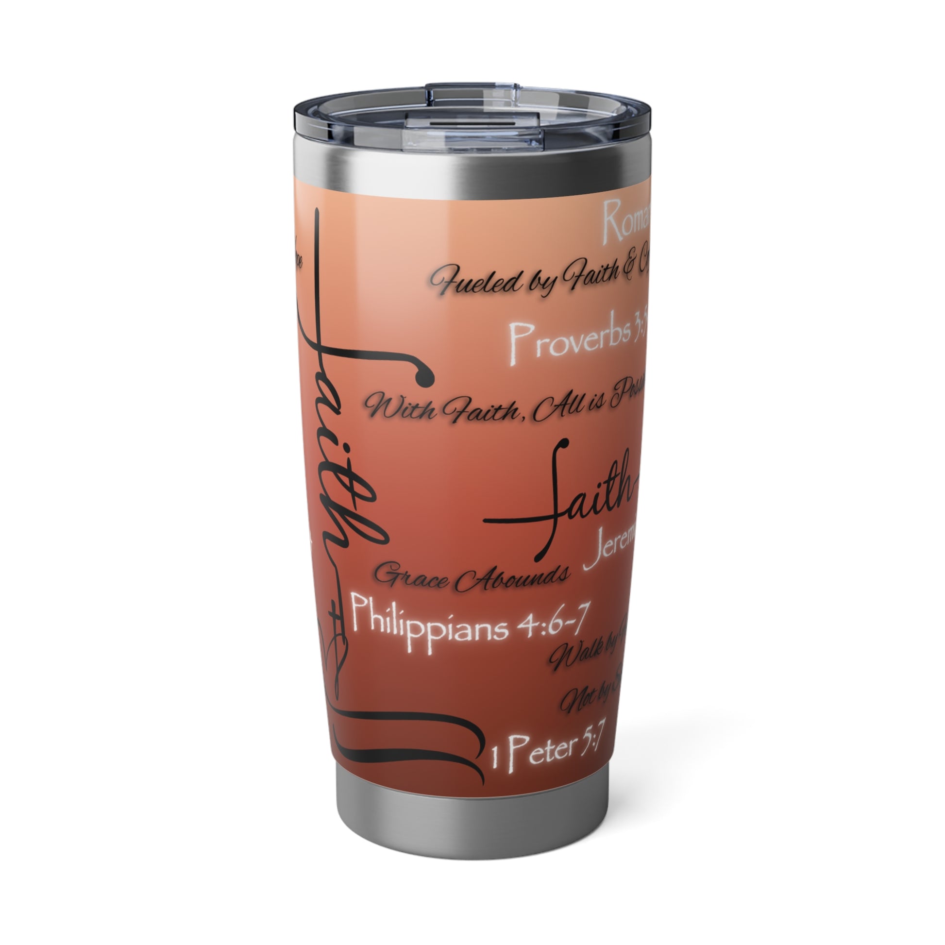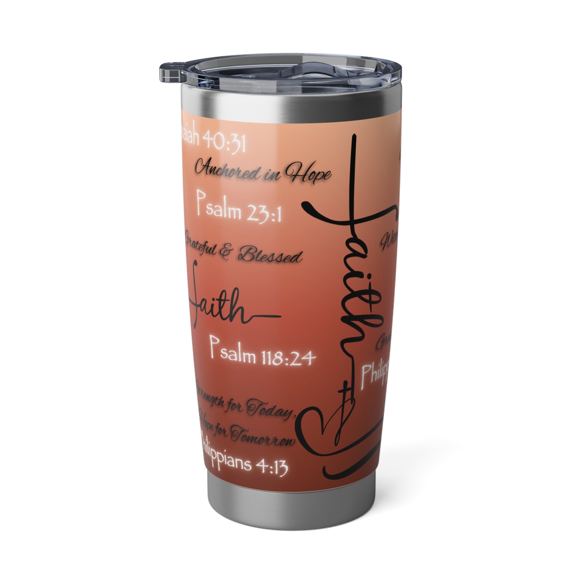 This 20oz tumbler isn’t just functional—it’s faith in motion. Covered in scripture-inspired phrases and anchored in spiritual truth, it’s designed for those who want their drinkware to speak with purpose. The bold design remains the same across a variety of color options, allowing you to choose the one that reflects your style while holding onto what matters most.