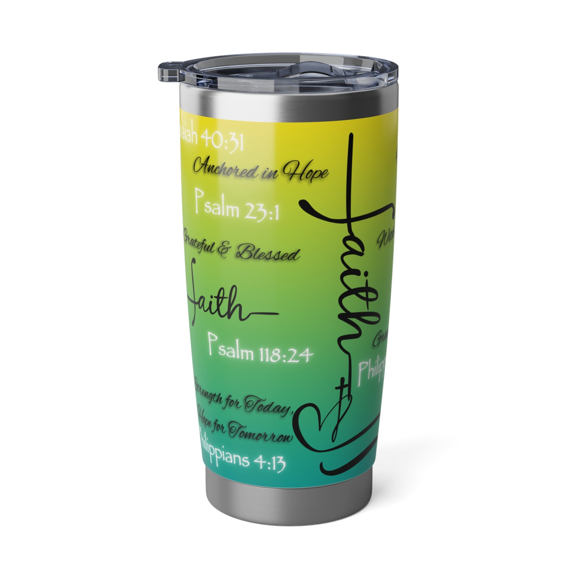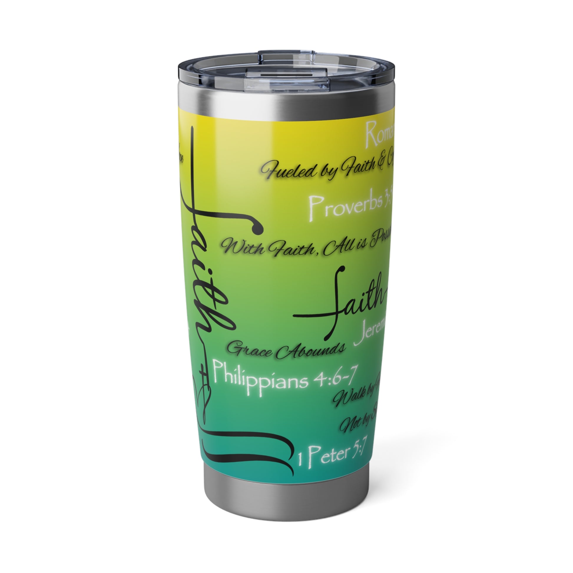 This 20oz tumbler isn’t just functional—it’s faith in motion. Covered in scripture-inspired phrases and anchored in spiritual truth, it’s designed for those who want their drinkware to speak with purpose. The bold design remains the same across a variety of color options, allowing you to choose the one that reflects your style while holding onto what matters most.